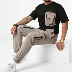 Nouveau ⭐ Ensemble Tee 👕 Shirt Poche Et Pantalon Jogging F22-908T Noir Gris de Classic Series 🤩