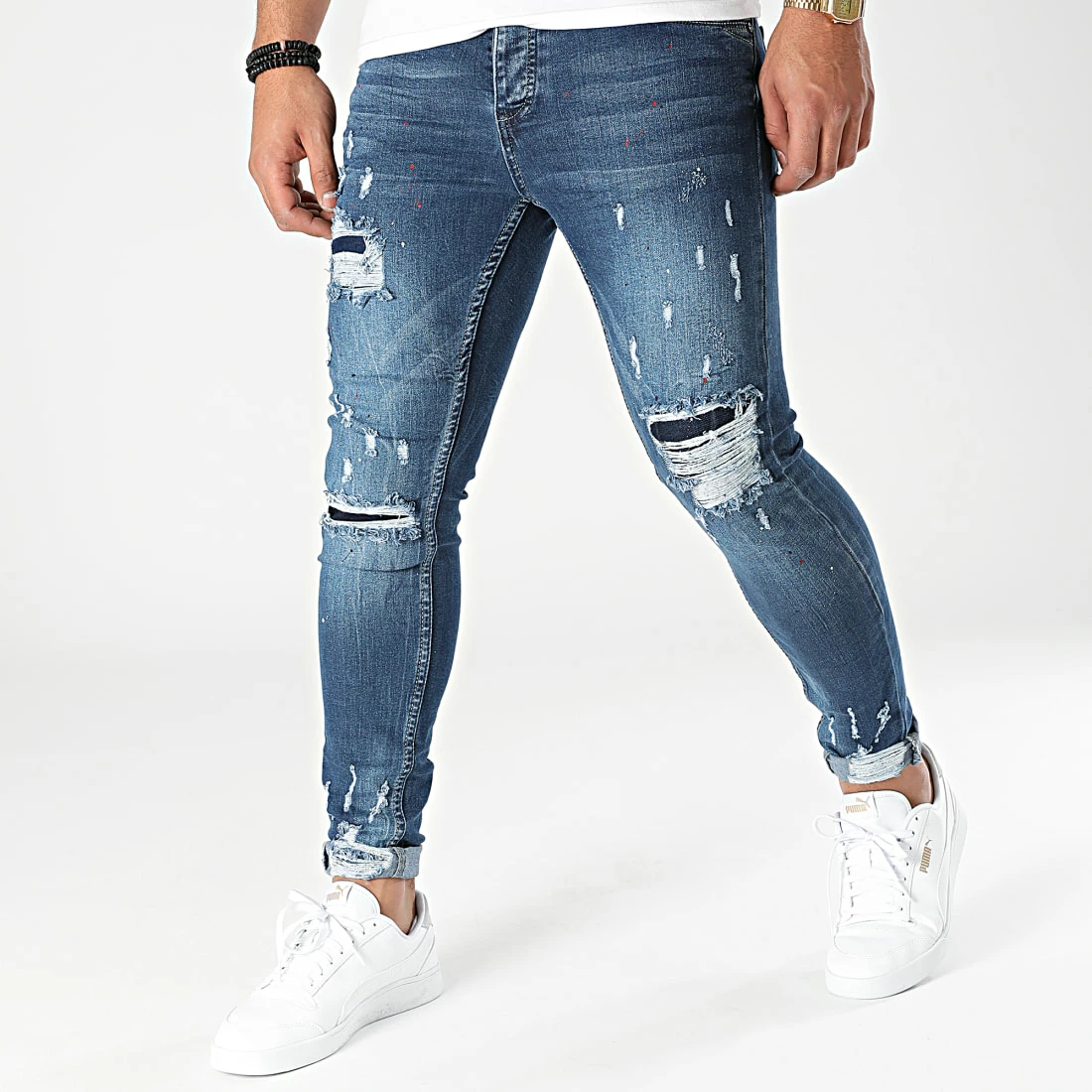 • Jean skinny à finition délavée, usée et tachée avec rapiéçages