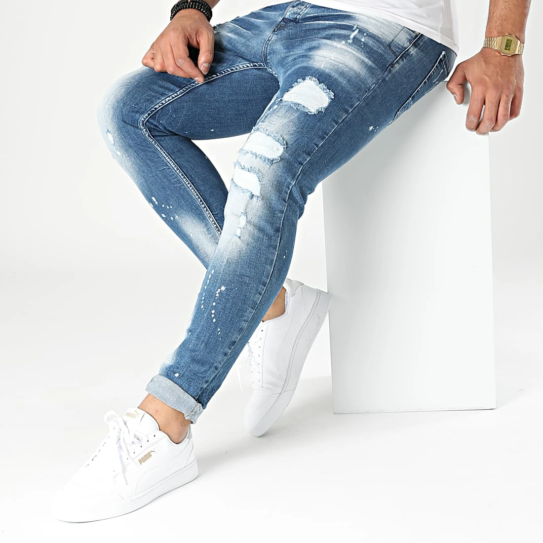 • Jean skinny à finition délavée, tachée et usée avec rapiéçages